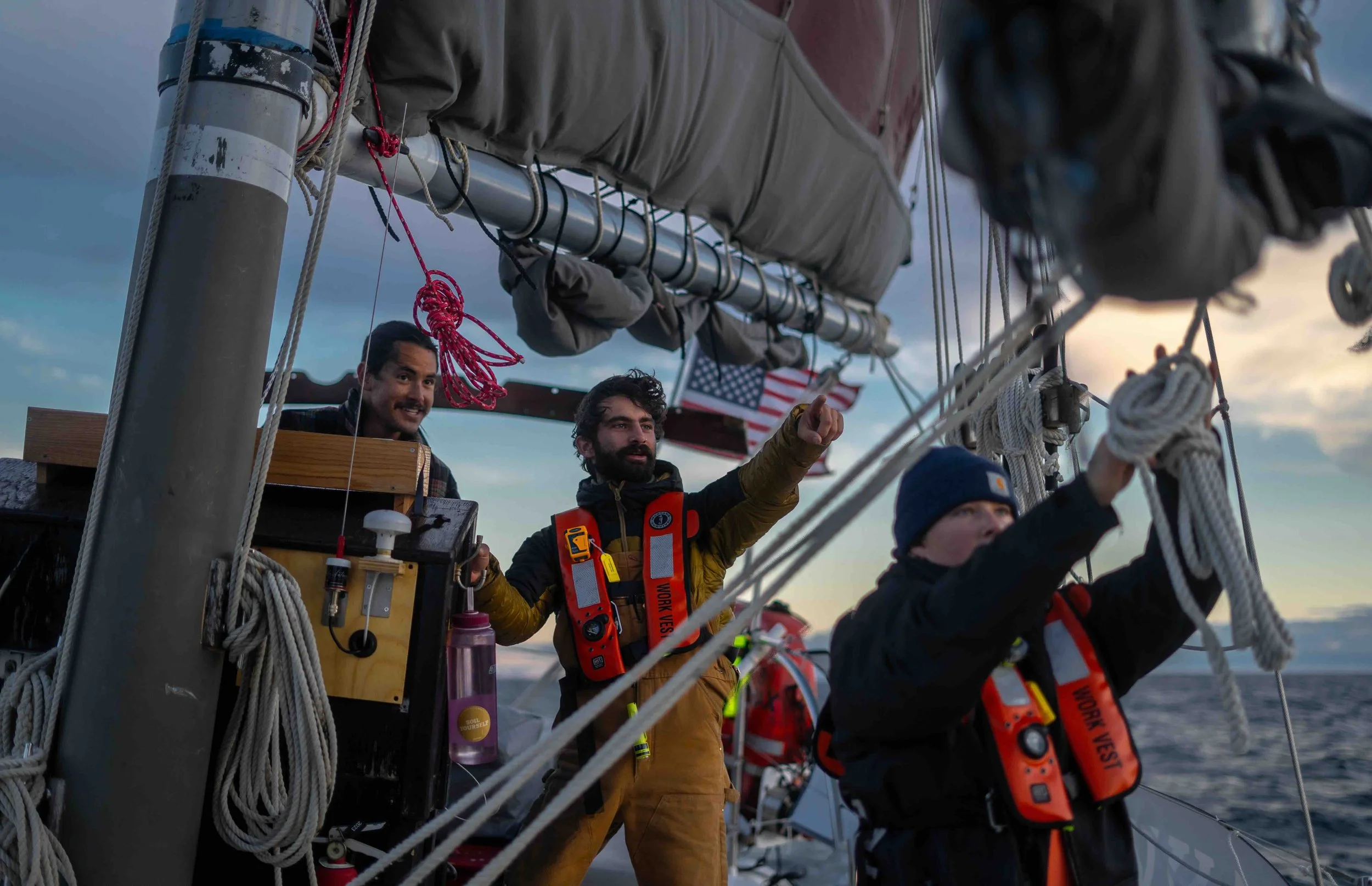 Steering the boat is a duty you will rotate through on watch and it is not as easy as it looks. When the sails are up, there are multiple unbalanced forces acting on the vessel that are challenging to compensate for. New helmsmen frequently overcorrect and spend too much time looking at the compass instead of the horizon. While there is science behind all of this, what you will come to realize is that you need to “feel it.” Over the course of the voyage, your gaze will elevate from the compass to the sky until you find the perfect star in the rigging to steer the boat by. Slowly, you will start to sense when to be firm with the helm and when to let Wonder roll naturally over a swell. Helm duty is so much more than just steering, it is about paying close attention to all of your senses to connect with the ship and the ocean.
