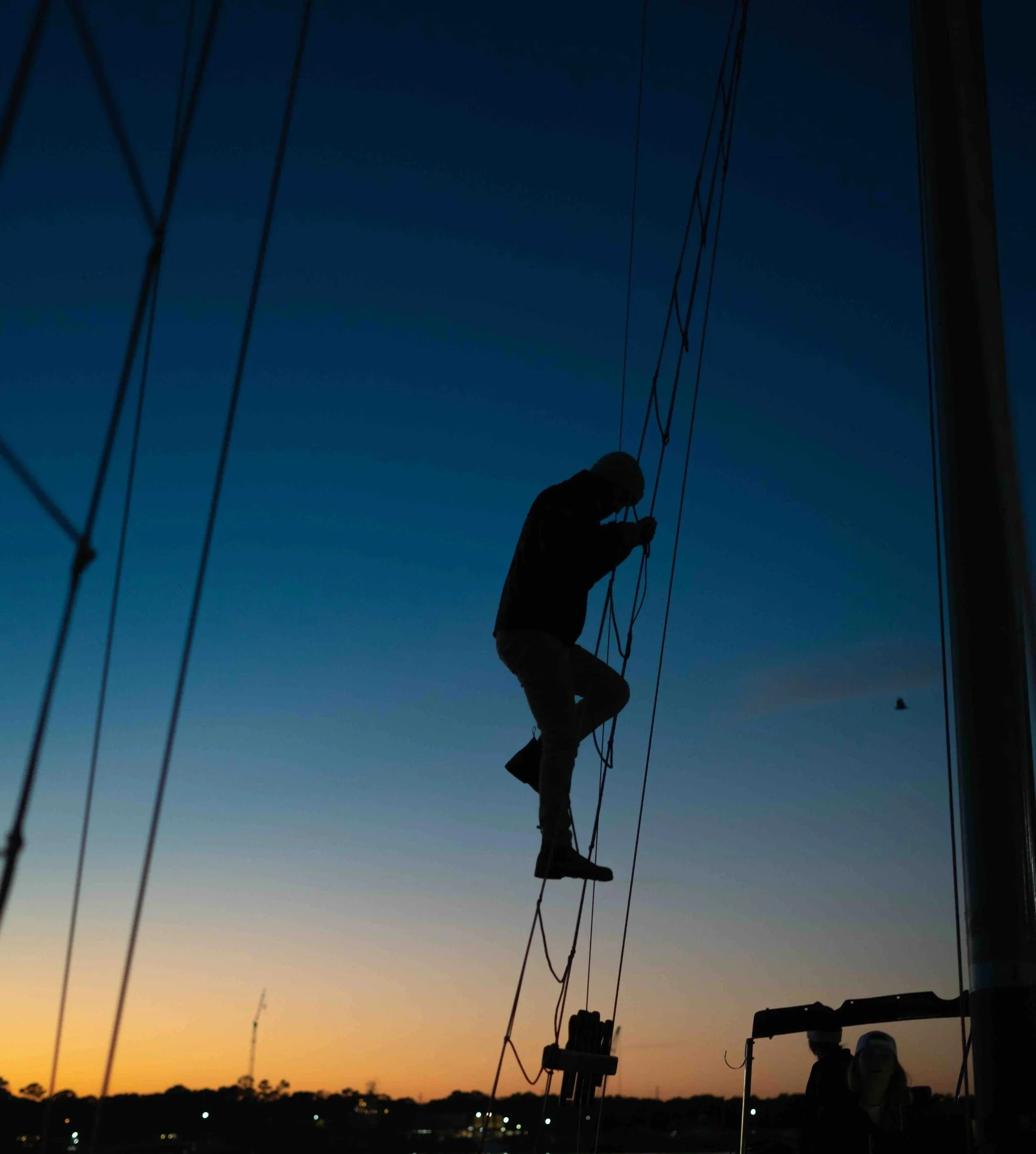 Setting and striking sails, tacking and gybing, furling and trimming…these will start as foreign concepts and quickly become second nature. Sail handling is almost never done alone; you rely on your shipmates to help accomplish a shared goal. Working together to complete a sail evolution will start off a bit clunky, but through the way we repeat commands and repeat tasks, your watch will become a highly functional team. Feeling it “click” with your watch as you perform a well-executed sail maneuver will help make you a better leader, follower, and teammate.